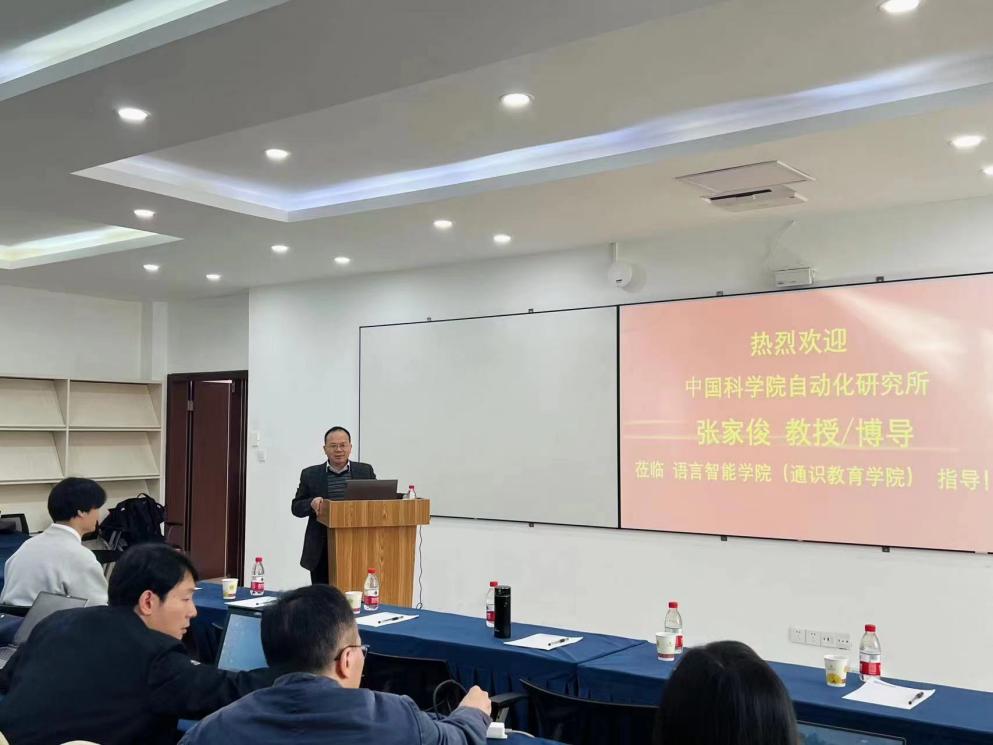 活动伊始,语言智能学院(通识教育学院)院长姜孟教授致欢迎辞,热烈欢迎来自中国科学院自动化研究所的张家俊教授莅临本院指导学习,张教授主要从事自然语言处理、语言模型及应用等领域研究,主持科技创新2030——“新一代人工智能”重大项目,发表CCF-A/B类论文90余篇,出版学术专著2部、译著1部, 成果丰硕,业界知名。