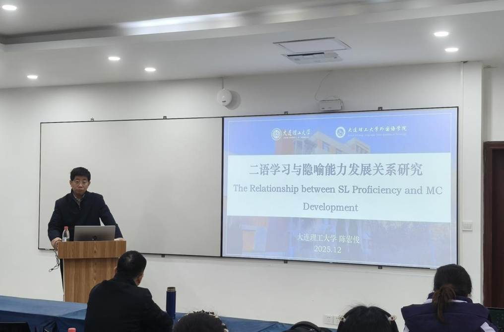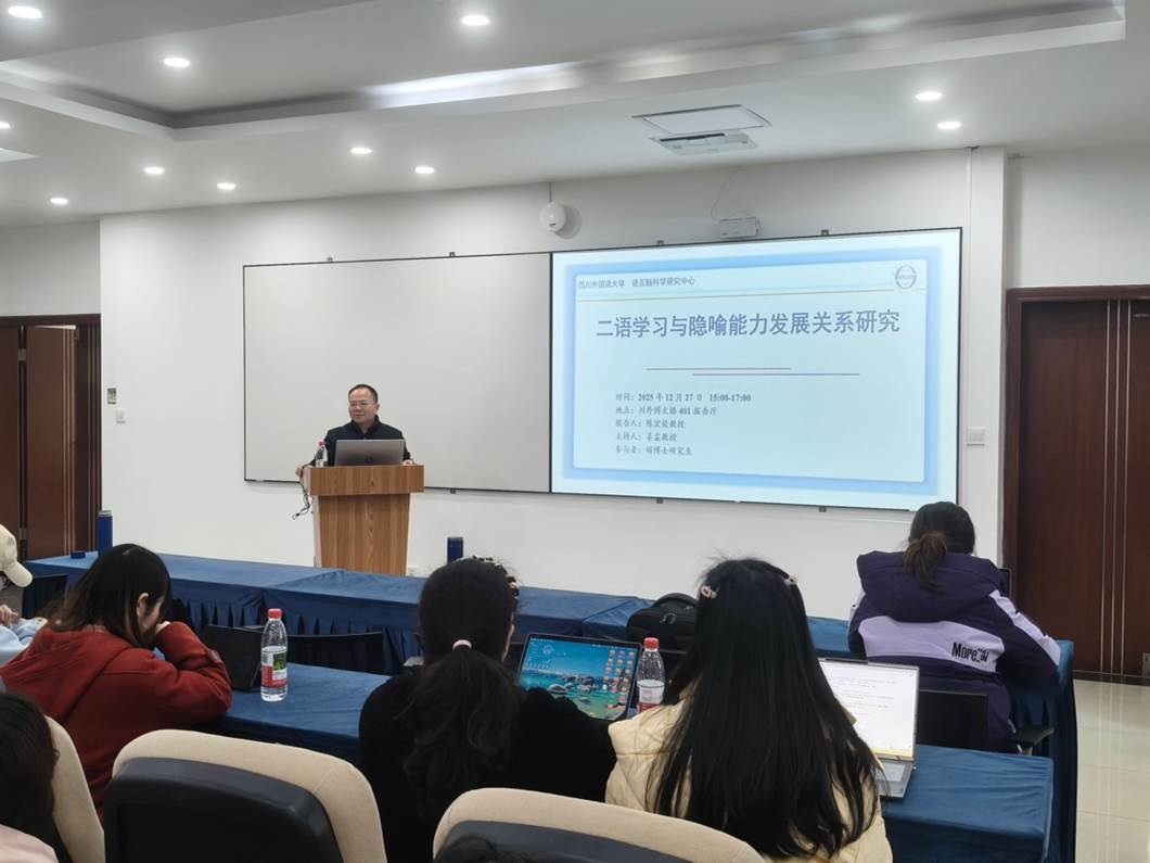 2025年12月27日下午,大连理工大学外国语学院院长、博士生导师陈宏俊教授应邀到“语言智能大讲堂‘专家讲坛’”作题为“二语学习与隐喻能力发展关系研究”的学术讲座。活动在四川外国语大学博文楼401报告厅举行,由语言智能学院(通识教育学院)院长、语言脑科学研究中心主任姜孟教授主持,学院部分教师及硕博士研究生参加了此次活动。