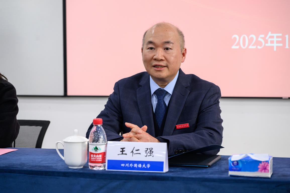 参观结束后,何勇副区长一行与我校代表在博文楼401报告厅开展调研座谈会。座谈会由党委常委、副校长王仁强主持。王仁强对何区长一行的到来表示热烈的欢迎,他简要介绍了学校的基本情况并对沙区政府长期以来对学校的支持表示感谢。他表示,川外与沙区政府有着深厚的合作基础,期待此次调研能够进一步加强双方交流,共同探索新的合作契机,推动校地协同深入发展。